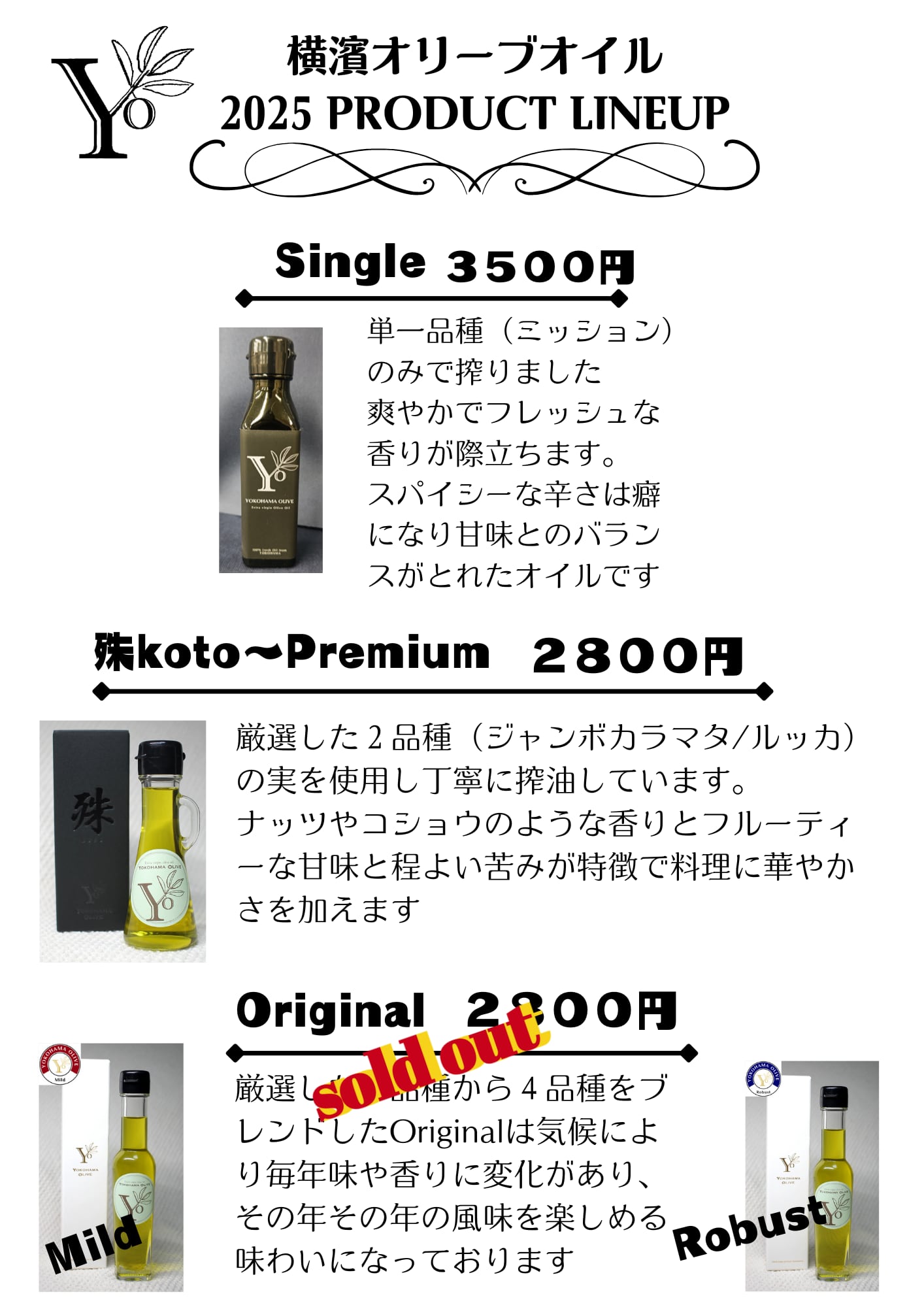 ・横濱オリーブオイルOriginal「Robust」 気候により毎年味の変化があり、その年、その年の味が楽しめます 「ミッション」「アルベキーナ」「モライオロ」 のブレンドオイルになっています。 フルーティーでありながら辛みは強めのオイルです。 # 横濱オリーブオイル Original 86g (90mlボトル) 豊かな風味と上質な香りが魅力の「横濱オリーブオイル Original」は、厳選されたオリーブを使用し、丁寧に搾油したエクストラバージンオイルです。フルーティーで滑らかな味わいは、サラダやパスタはもちろん、バーベキューやグリルしたお肉にもよく合います。少しの量で料理をグレードアップさせるこのオイルは、毎日の食卓に欠かせない存在になることでしょう。また、シンプルでスタイリッシュなボトルデザインは、キッチンでもテーブルでも映えます。 ■ カラー/サイズ/バリエーション 内容量:86g ■ 素材/製造国 使用している素材は100%オリーブ(エクストラバージン) ■ お手入れ/取り扱い注意事項 直射日光を避け、冷暗所でまたは箱に入れて保存してください。開封後は新鮮さを保つために早めにご使用ください。 ■ 発送・注文に関する情報や注意事項 ご注文いただいてから通常2~3日以内に発送いたします。詳しい予約状況については、注文確定後にご確認いただけます。 ■ その他の情報や注意事項 アレルギーをお持ちの方は、原材料をご確認の上、ご購入をお願いいたします。 この商品についての問い合わせは、ショップのお問い合わせからお気軽にご連絡ください。こだわりの「横濱オリーブオイル Original」で、あなたの料理をさらに美味しく仕上げてみませんか!
